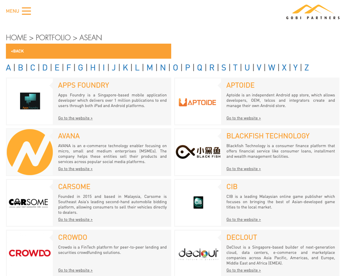 고비 파트너스는 2002년 설립해 현재까지 13개 펀드를 모아 250개 이상 스타트업에 투자했다. 투자한 아세안 스타트업만 해도 50개가 넘는다. 투자한 주요 스타트업으로 아세안 온라인 프리랜서 플랫폼 패스트워크(Fastwork), 말레이시아 중고차 판매 플랫폼 카썸(Carsome), 아세안 전자 상거래 플랫폼 오라미(Orami) 등이 있다.