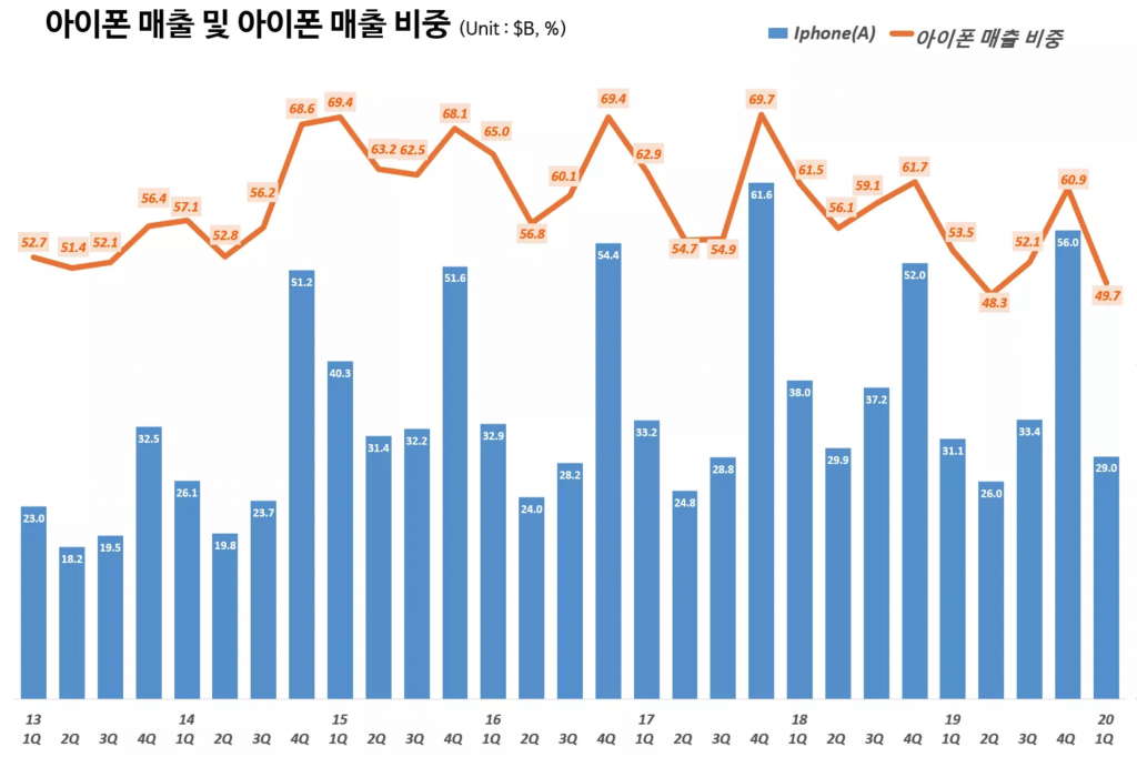 애플 매출은 크게 ▲아이폰 ▲서비스 ▲맥 ▲아이패드 ▲웨어러블, 액세러리 등으로 나눌 수 있는데요. 이중 아이폰 매출은 50%로 대부분 비중을 차지하고 있습니다.