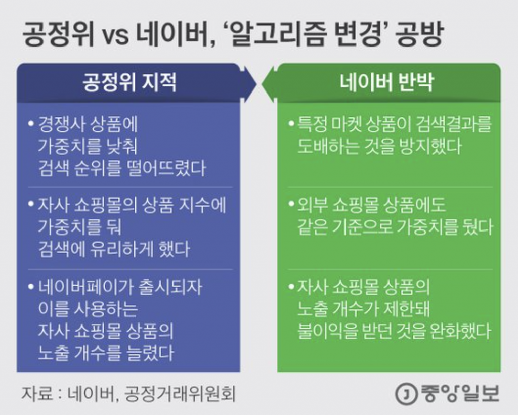 공정위는 과징금 부과 이유로 네이버가 검색 알고리즘을 조정・변경해 부당하게 검색결과 노출 순위를 조절한 것을 지적했습니다. 이를 검색 결과가 객관적이라고 믿는 소비자를 기만하고, 오픈마켓 시장과 동영상 플랫폼 시장 경쟁을 왜곡한 것이라 봤습니다.