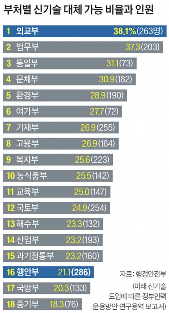 행정안전부 ‘미래 신기술 도입에 따른 정부인력 운용방안’ 보고서에 따르면 국내 18개 중앙 정부 부처에 신기술을 도입하면, 재직 공무원 25%를 대체할 수 있는 것으로 나타났습니다. 지난해 9월 기준 중앙 부처 공무원 1만 2천 명 중 3006명(25%)을 대체할 수 있다는 이야기입니다.