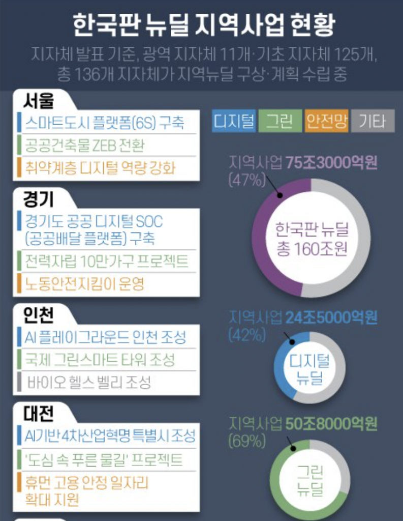 이에 정부는 지난 13일 오전 청와대에서 문재인 대통령이 주재한 제2차 한국판 뉴딜 전략회의에서 한국판 뉴딜 사업비 160조 원 가운데 75조 원을 지역에 투자한다고 발표했는데요. 이는 사업비의 47%로 절반에 가까운 금액입니다.