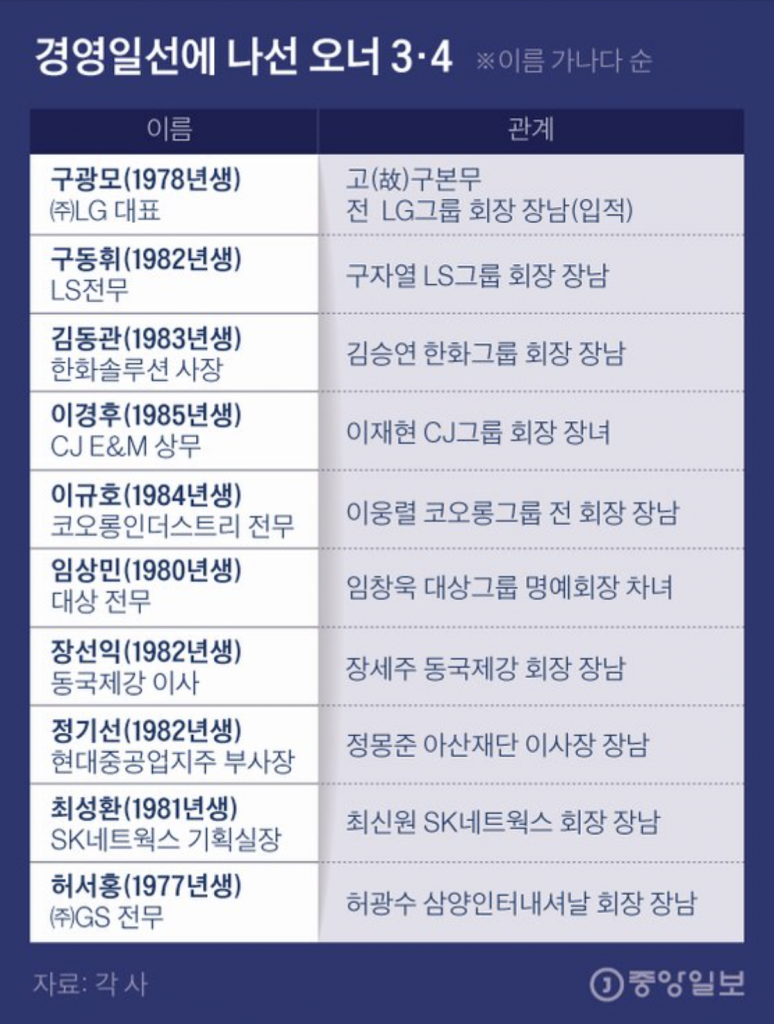이 밖에 구동휘 LS전무, 구본권 LS니꼬동제련 상무, 이경후 CJ E&M 상무, 이규호 코오롱인터스트리 전무, 정기선 현대중공업지주 부사장 등 업계 곳곳에서 3·4세가 나서고 있습니다.