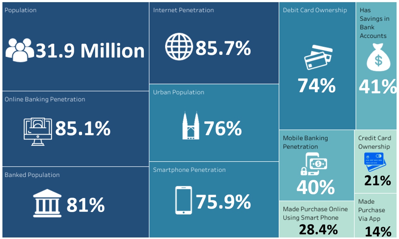 말레이시아 핀테크 보고서 2018에 따르면 말레이시아는 높은 은행 계좌 보유율은 물론, 인터넷 보급률, 스마트폰 보급률, 도시 인구 등 핀테크 서비스가 올라갈 수 있는 충분한 인프라를 갖췄다. 특히, 영어를 공용어로 사용하는 환경 또한 테스트 베드로 사용하기 적절하다.