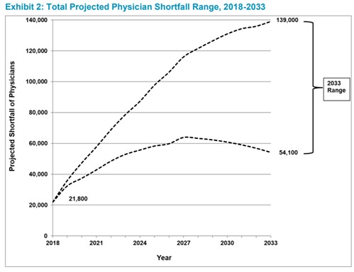 아래는 미국의 사례인데요, 미의과대학연합회에 따르면, 2018년에는 약 2만 명의 의사가 부족했고, 2033년에는 최소 5.4만 명에서 13.9만 명의 의사가 부족할 것으로 예상됩니다.