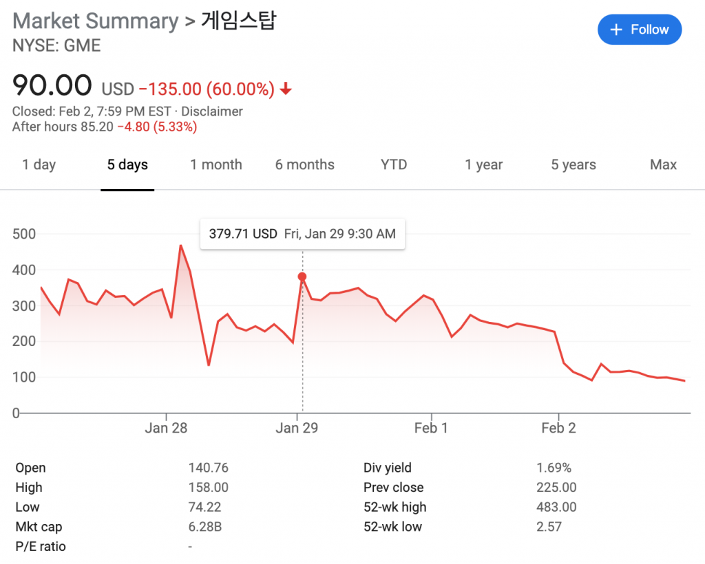 현지시각 화요일 레딧의 반란을 주도했던 게임스톱(GameStop)과 AMC의 주가가 매우 큰 폭으로 떨어졌습니다. 게임스톱의 주식은 하루에만 60%가 폭락하며 주당 가격이 90달러로 떨어졌는데요. 저번주 금요일에 한주당 가격이 380달러에 육박했던 것과 비교하면 엄청난 폭락입니다. AMC 또한 40% 이상의 폭락을 피하지 못했습니다.
