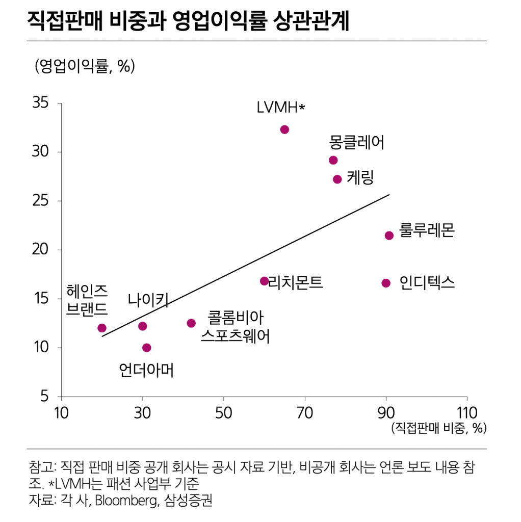 실제로 나이키의 영업이익률은 15%가 채 안 되던 것에 반해 룰루레몬은 20% 이상의 영업이익률을 거두었습니다. 직접판매로 인한 영업이익률이 가져온 직접적 결과로 보입니다.