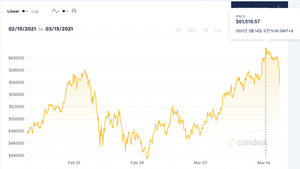 비트코인의 시총이 이렇게 높아진 데에는 최근 비트코인 가격의 폭발적인 성장에 있습니다. 지난달 테슬라의 CEO 일론 머스크가 15억 달러 규모의 비트코인을 구매함에 따라 가격이 뛴 것인데요. 지난주 비트코인 1개당 가격이 61,519달러에 육박하기도 했죠. 한화로는 거의 7,000만 원에 가까운 금액이었습니다.