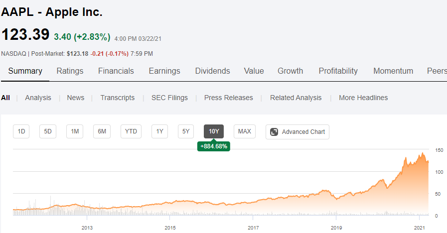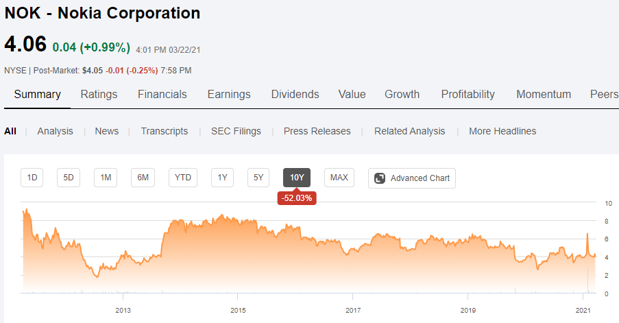 산업주기를 가장 잘 보여주는 시장이 있습니다. 바로 스마트폰 시장입니다. 위 그래프는 대표적인 스마트폰 4개 기업의 10년 주가 그래프입니다.