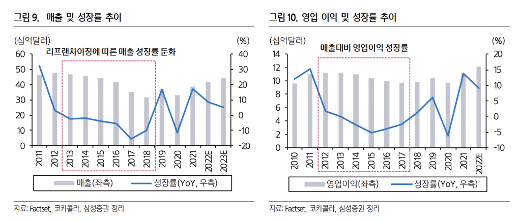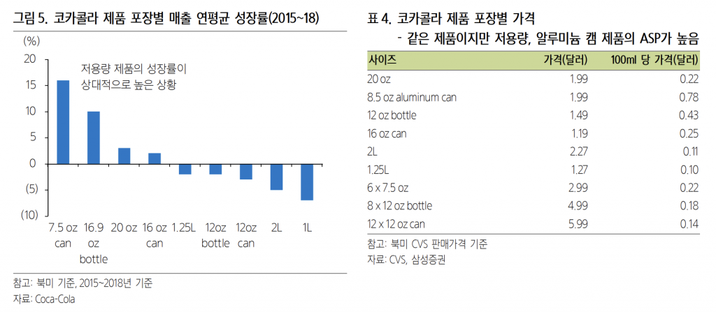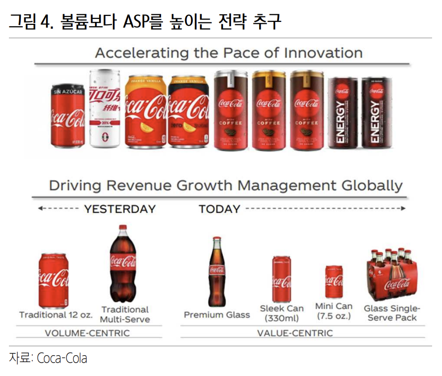 매출 증대를 위해 평균 판매 단가(ASP, Average Selling Price)를 높이는 전략 사용했다. 같은 제품임에도 저용량 알루미늄 캔 제품이 단가가 높다. 여기에 저용량 제품이 상대적으로 성장률도 높다. 1886년 이래 130년이 넘도록 같은 제품을 팔면서 꾸준히 성장할 수 있던 포인트 중 하나다.