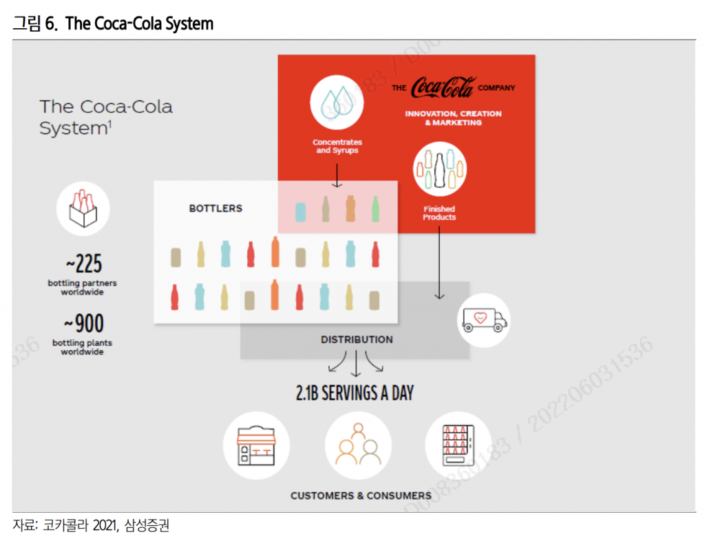 현재 글로벌 보틀링 파트너사는 225개, 보틀링 공장은 900개를 보유하고 있다. 매일 음료 21억 병을 판매하는 중이다.