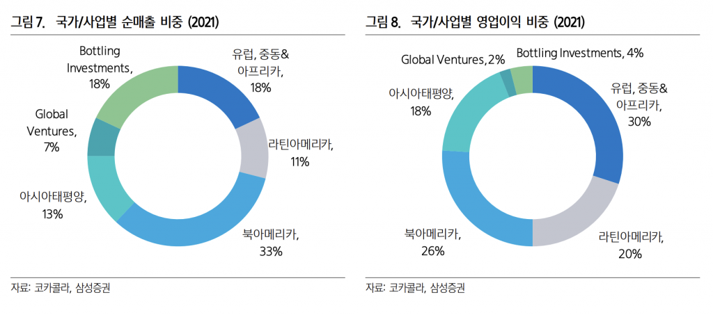 지표를 보면 북아메리카에서 매출이 33%나오지만 영업이익은 26%다. 매출 11%를 담당하는 라틴아메리카에서 영업이익 20%로 높은 마진을 보여준다.