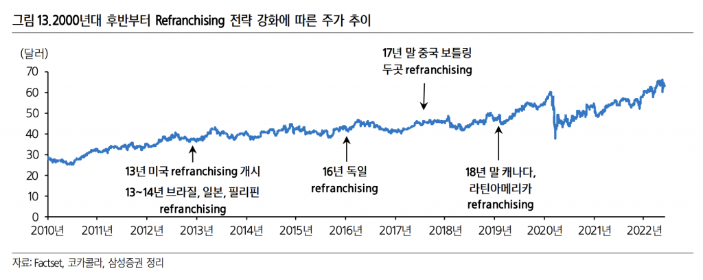 1899년, 코카콜라 본사에서 원액을 배송하고, 지역별 생산공장이 완제품 가공부터 유통까지 담당하며 코카콜라의 글로벌 시장 침투가 가속화됐다. 하지만 이 전략이 둔화되며 경영진은 수익성을 높이기 위해 리프랜차이징(refranchising) 전략을 시작했다. 코카콜라가 직접 보유한 보틀링 공장을 매각하고 원액 공급 독점 계약을 맺거나 계약을 재편해 매출보다 수익성에 무게를 둔 것이다.