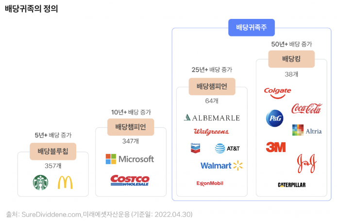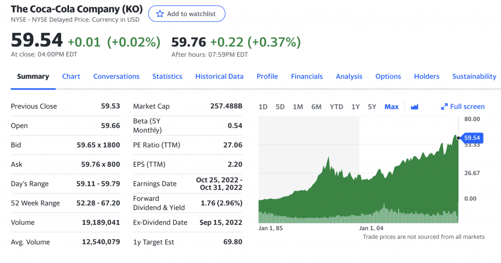 S&P500에 속한 종목 중 25년 이상 주당 배당금을 늘려온 주식을 ‘배당 귀족주’라고 한다. 그리고 50년 이상 배당을 늘려온 주식을 ‘배당 왕’이라 한다. 코카콜라는 현재 배당수익률이 2.8%이고, 50년 연속 배당금이 상승하는 ‘배당왕’ 중 하나다.
