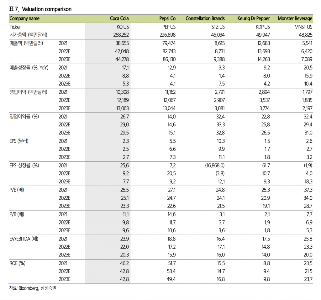경쟁사 지표를 보면, 2위 펩시가 의외로 시가총액이 1위 코카콜라와 비슷하고 매출은 오히려 더 많다. 그런데 영업이익은 비슷하고 매출성장률은 코카콜라가 17.1, 펩시가 12.9로 코카콜라가 우세다.