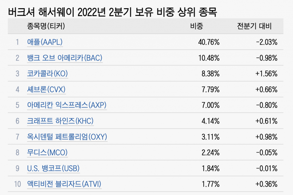 친구들을 집에 초대한적이 있는데 냉장고를 보더니 코카콜라 주식을 사야겠다고 말했다. 문득 워렌버핏도 코카콜라를 보유하고 있다는 게 생각났다. 워렌버핏도 코카콜라를 좋아하는데, 2022년 2분기 기준 버크셔 해서웨이 포트폴리오에서 무려 3위에 해당하는 8.38% 비중이 코카콜라다.