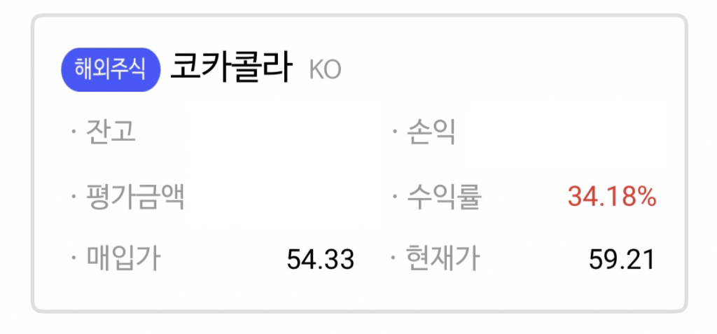 그쯤 코카콜라를 사서 계속 가지고 있었다. 달러가 많이 올라서 수익률이 34%에 달한다. 실제 주가는 그정도는 아니다.
