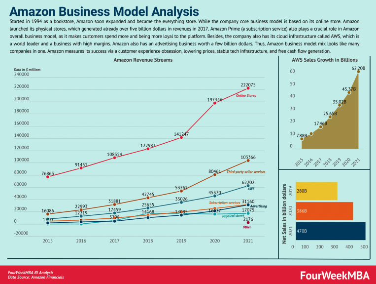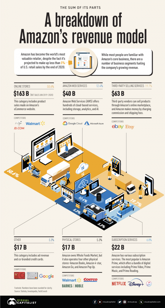 아마존 수익모델은 크게 ▲온라인 스토어 ▲AWS ▲서드파티 판매 서비스 ▲구독 서비스 ▲피지컬 스토어 ▲그외 등으로 나눌 수 있다. 2020년 버전 이미지이니 숫자는 참고만 하자.