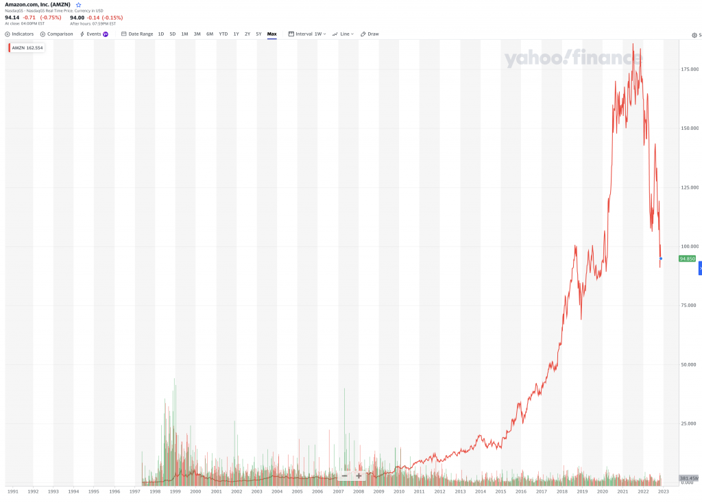 - 이후 1990년대 후반 다양한 사업에 투자하는데 닷컴 거품이 꺼지면서 꽤 어려운 시기를 겪었다. 이 시기 주요 실패로 기록되는 펫츠 닷컴(Pets.com)은 1998년 11월에 시작해 2년 뒤인 2000년 11월에 폐쇄됐다. 당시 베이조스는 5천만 달러를 손해봤다.