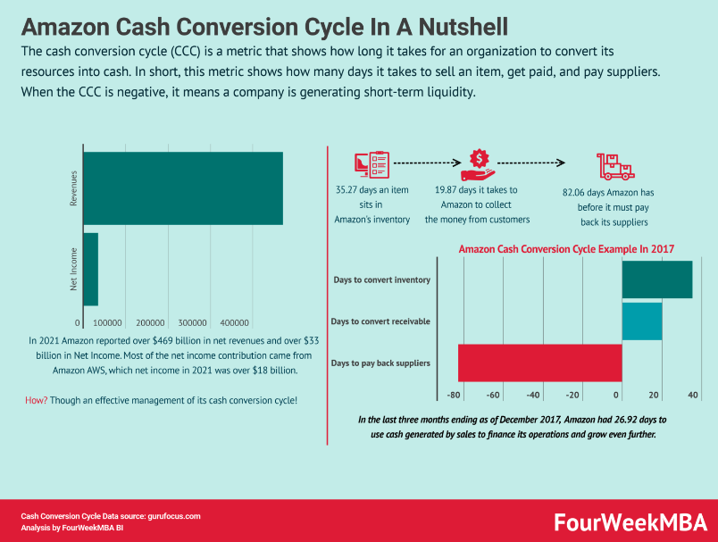 - 이 구조를 위해 아마존은 먼저 물건을 받고, 소비자에게 물건을 판 뒤, 판매자에게 수수료를 제외하고 입금하는 시간이 꽤 길다. 이 과정에서 아마존은 현금을 보완하고 있고 이를 운용자금으로 사용할 수 있다.