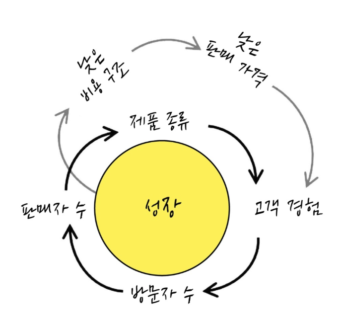 - 하나는 제품 종류 → 고객 경험 → 방문자 수 → 판매자 수 → 제품 종류로 이어지는 바퀴