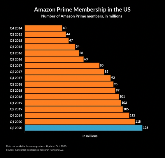 - 아마존 프라임은 미국 회원이 1억 2600만 명에 달하는데 매년 성장하고 있다.