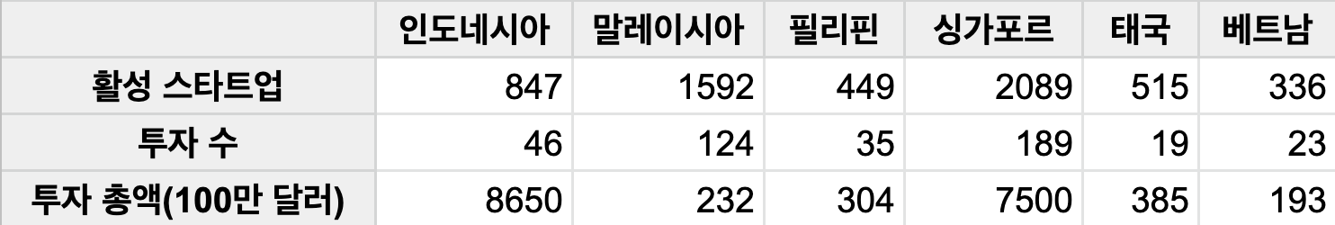 말레이시아는 인도네시아보다 2배 가까운 스타트업 수를 자랑하지만, 투자 금액은 약 37배가 적다. 또한 싱가포르는 인도네시아보다 4배 많은 투자 수를 기록했지만, 투자 총액은 인도네시아가 더 많다.