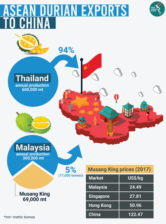 주요 두리안 생산국인 태국은 이와 같은 폭발적인 수요의 증가로 행복한 비명을 지르고 있다. 실제로 전체 두리안 수출 시장의 94%를 독점하고 있는 태국은 대중국 수출이 매년 30%씩 늘어 현재 이들의 두리안 총수출의 80% 이상이 중국으로 유입되고 있다. 상황이 이렇게 되니 두리안의 가격 상승은 당연한 수순이다. 실제로 수확량이 적은 시기 한때 중국에서의 두리안 가격이 개당 60달러 (한화 7만)를 상회했다.