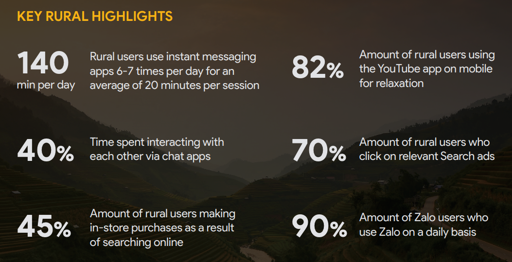 ▲농촌 사용자는 인스턴트 메시징 앱을 하루 6~7회 세션당 평균 20분씩, 하루 평균 총 140분 사용한다. ▲82% 농촌 사용자가 유튜브를 휴식하면서 사용한다. ▲잘로(베트남 1위 SNS) 사용자 90%가 매일 잘로를 사용한다.